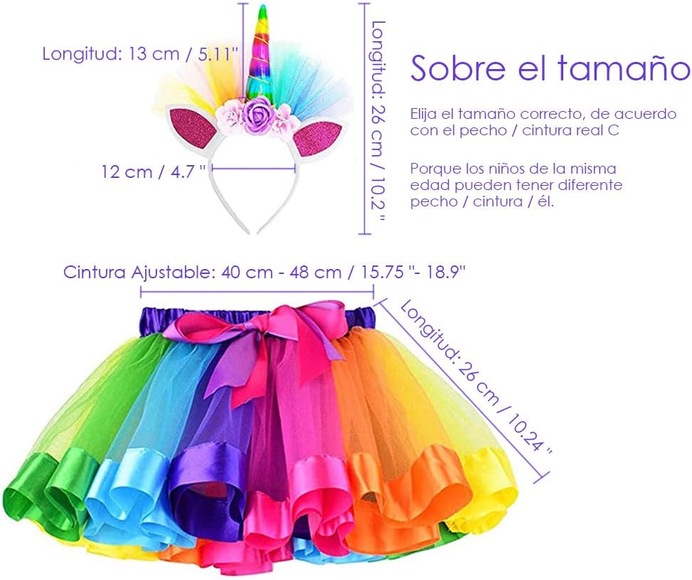 【Talla única para todos】 Talla de falda: M: talla cintura 40 cm / 15.75 ", relajada a 48 cm / 18.9 ", completamente estirada; longitud 26 cm / 10.24 ". L: tamaño la cintura 48 cm / 18.9", relajado a 58 cm / 22.8", completamente estirado; longitud 30cm / 11.8 ". Ancho diadema unicornio: 12 cm / 4.7 "; longitud: 26 cm / 10.2 ". Talla M mejor recomendada para niñas 1 a 8 años; La talla L se recomienda mejor para niñas 3 a 12 años. Mida el tamaño real la cintura su niña antes de realizar el pedido.