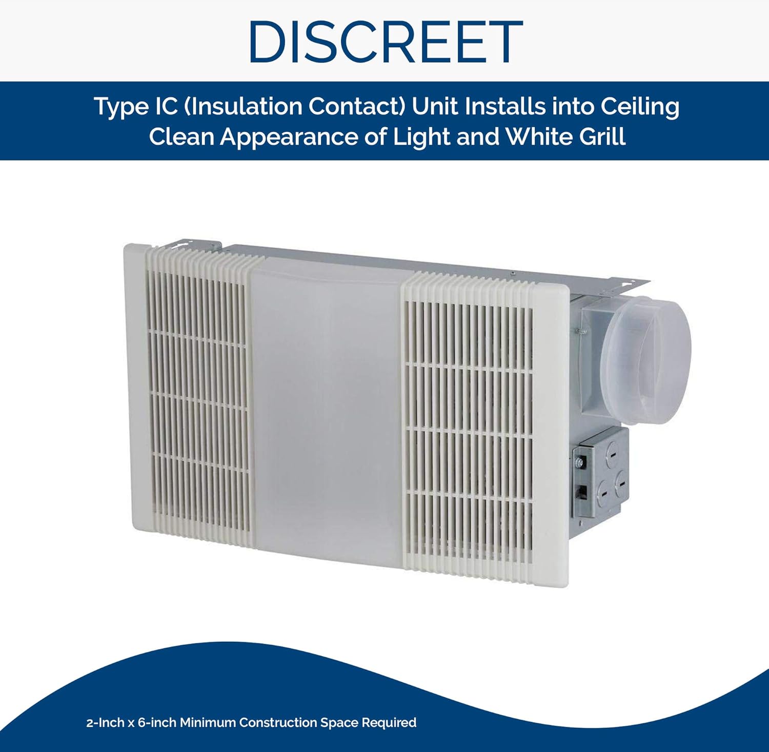 Compacto: se adapta a la construcción de techo de 5 x 6 pulgadas y funciona en baños de hasta 65 pies cuadrados. pies a 70 CFM y 4.0 Sones para un funcionamiento silencioso y eficaz