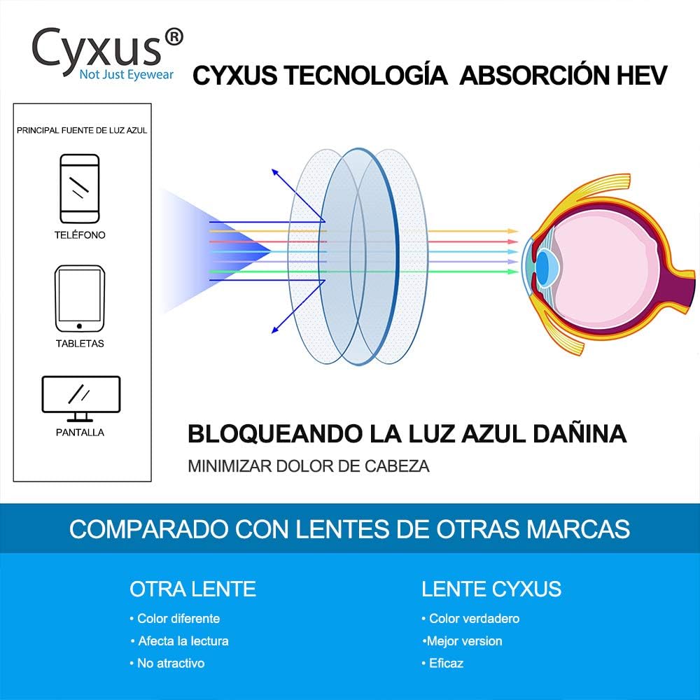 ❤ Protección UV -- los rayos UV y los reflejos del sol pueden dañar tus ojos. La radiación ultravioleta acelera el envejecimiento del ojo, lo que lleva a cataratas. La lente anti-azul Cyxus proporciona una protección sobre anti UV del 99,9%,protegiendo los ojos de la luz UV.