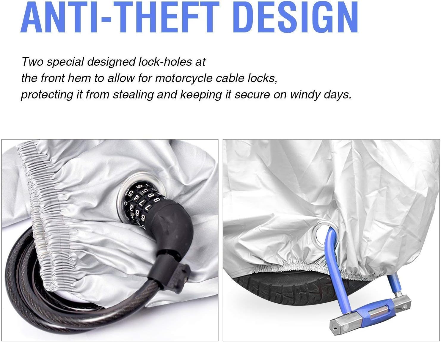 3. Diseño resistente al viento – Lona protectora para motocicleta, un par de hebillas para cinturón con correas ajustables en el borde delantero, hacen que la funda sea más segura, la funda no se caiga con el viento.