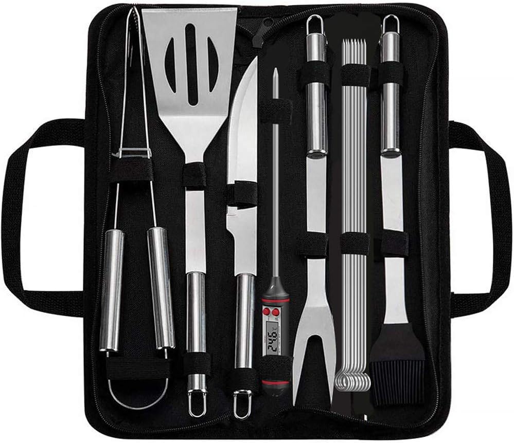 [TODO LO QUE NECESITA PARA SU PARRILADA] Este juego de utensilios para parrillada incluyen 1 pinza, 1 espátula, 1 cuchillo, 1 termómetro, 1 tenedor, 8 pinchos para brochetas y 1 brocha de cocina, Este juego de utensilio es totalmente capaz de ayudarle a hacer una deliciosa comida a la parrilla.
