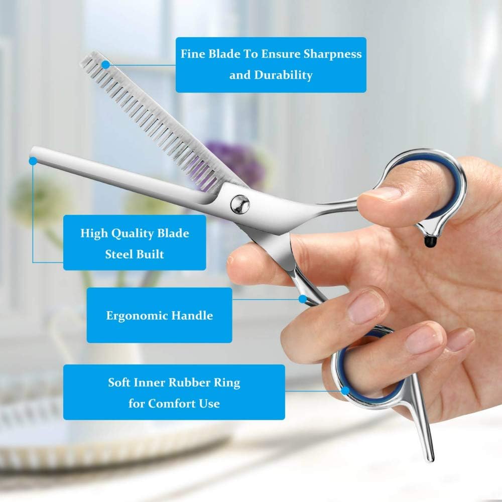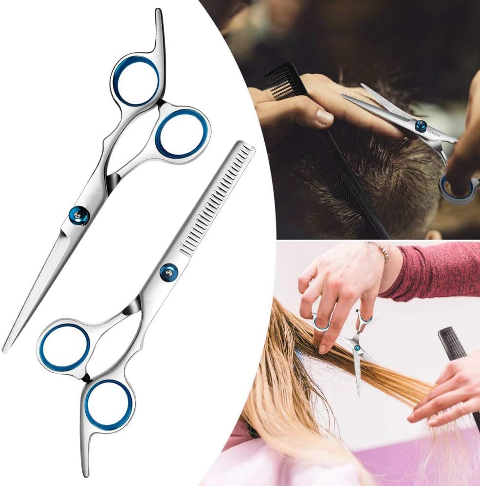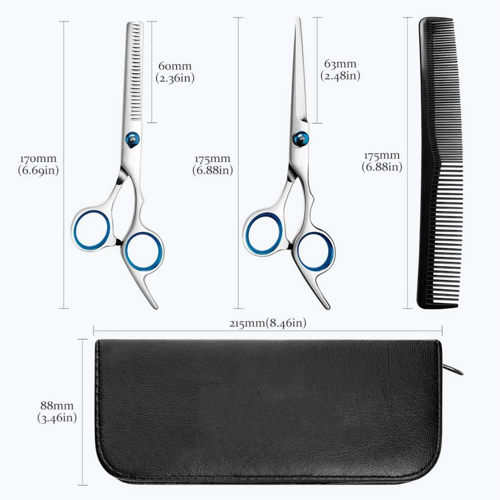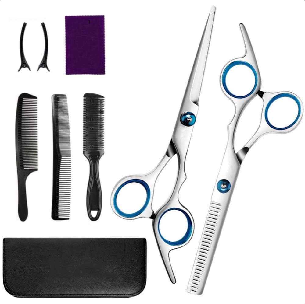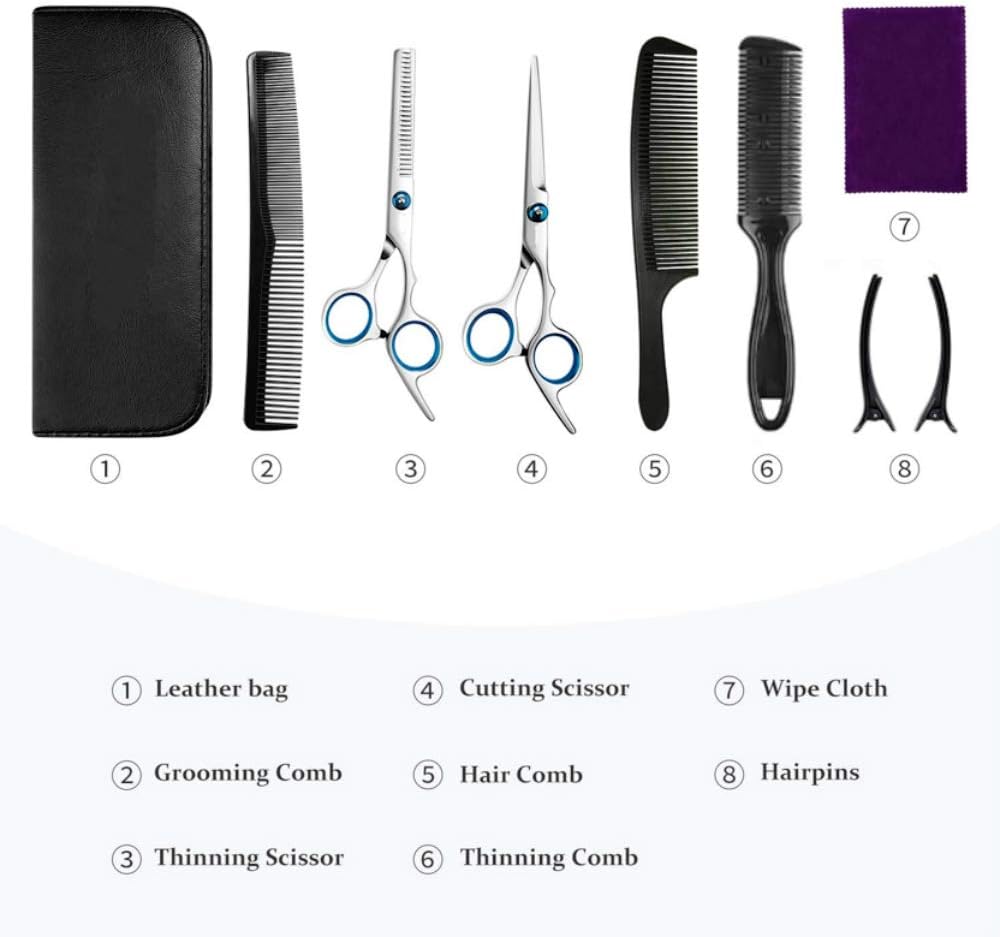 ✂ 〖Kit de corte de cabello todo en uno〗 1 x Tijera de corte, 1 x Tijera de adelgazar, 1 x Peine para rizar, 1 x Peine para alisar, 1 x Peine para adelgazar, 2 x Horquilla, 1 x Paño de limpieza, 1 x Cuero Bolso. El kit de corte de cabello satisface todas sus necesidades de corte y peinado.