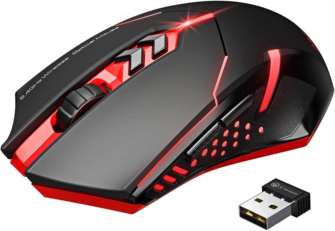 【5 Interruptor DPI Ajustable】 Este mouse inalámbrico para juegos no necesita ningún controlador, plug and play. 5 niveles DPI ajustables (800, 1200, 1600, 2000, 2400) para cambiar la velocidad del mouse libremente. Perfecto para Regalos de las Fiestas y de Cumpleaños!