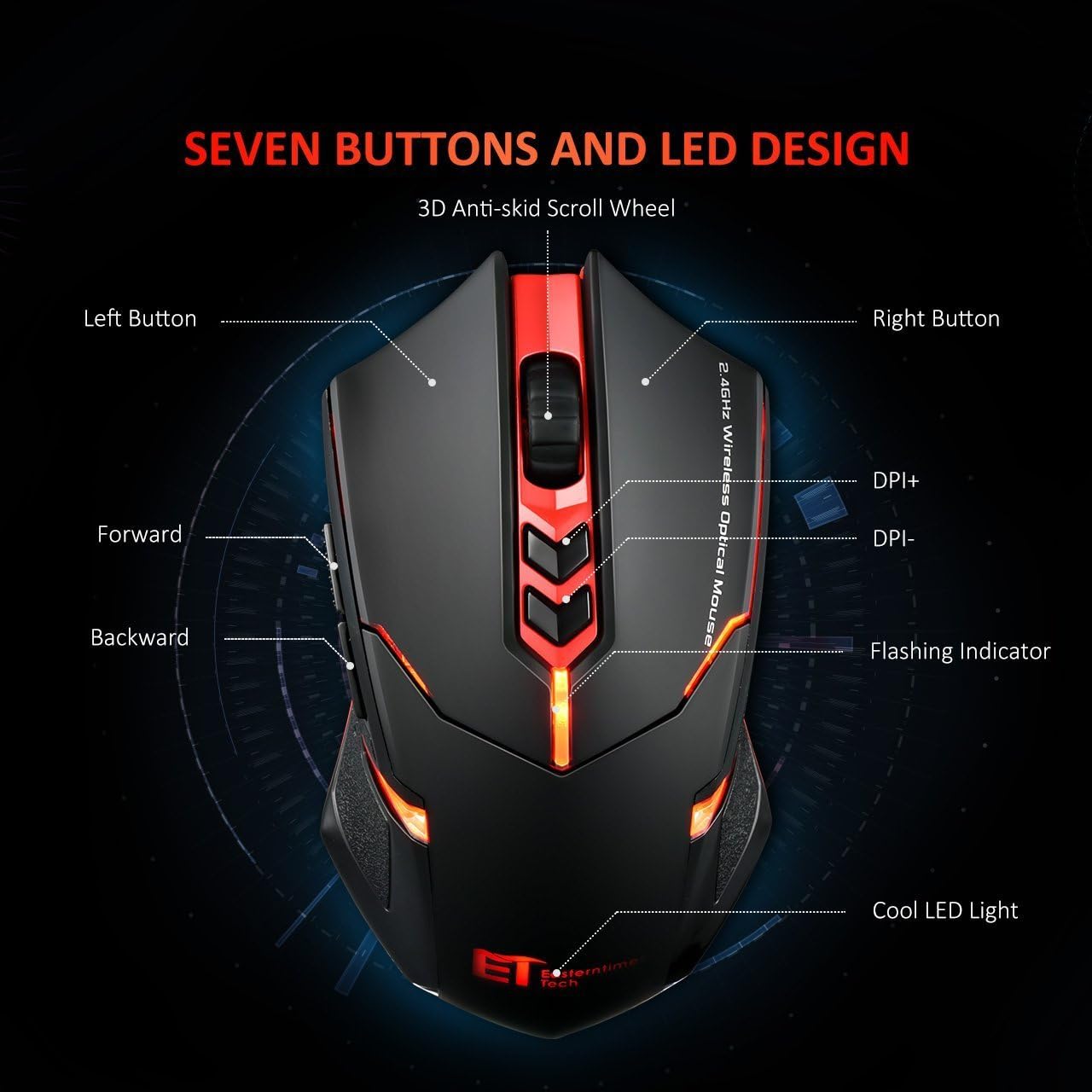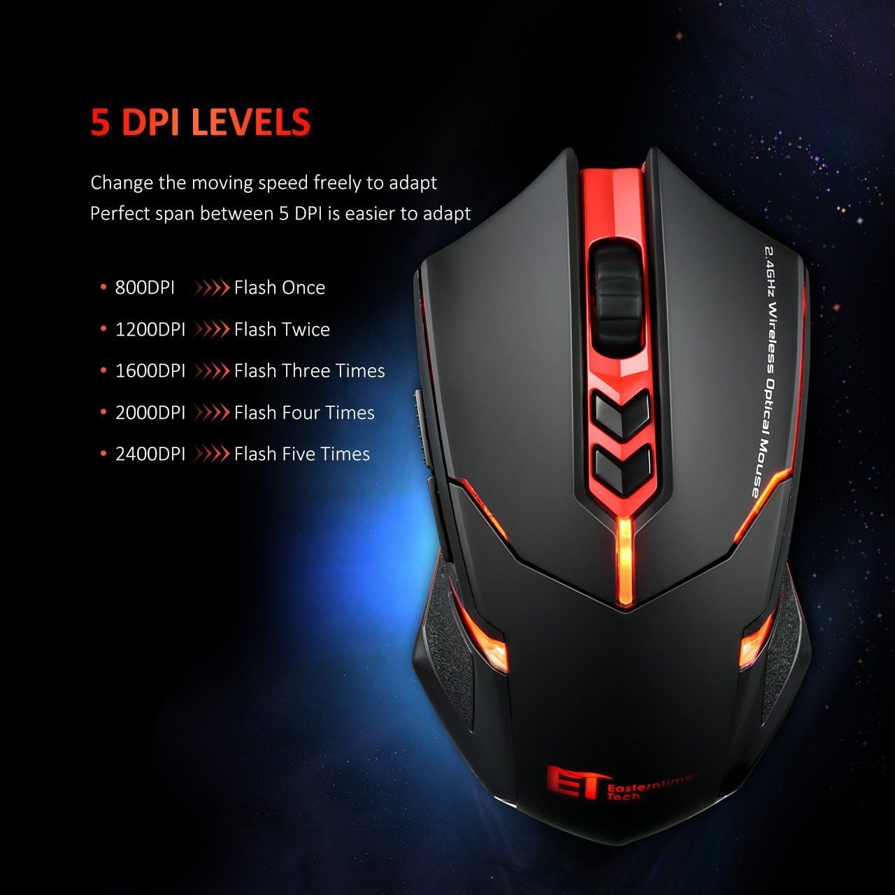 【5 Interruptor DPI Ajustable】 Este mouse inalámbrico para juegos no necesita ningún controlador, plug and play. 5 niveles DPI ajustables (800, 1200, 1600, 2000, 2400) para cambiar la velocidad del mouse libremente. Perfecto para Regalos de las Fiestas y de Cumpleaños!