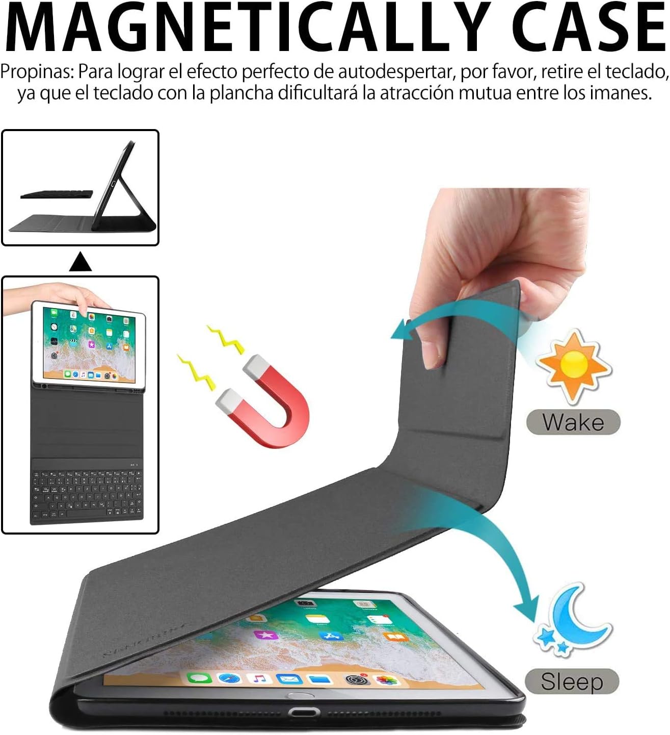 4. FUNCIÓN DE SUEÑO/DESPERTADOR INTELIGENTE (Solo modo de la funda) -- La pantalla del iPad se apagará automáticamente cuando cierre la funda, y se activará después de abrir la funda. La función protege y conserva la vida de la batería del ipad. Su magnético ayuda a reparar el teclado mientras tipea, esto le brindará una excelente experiencia de tipeo.