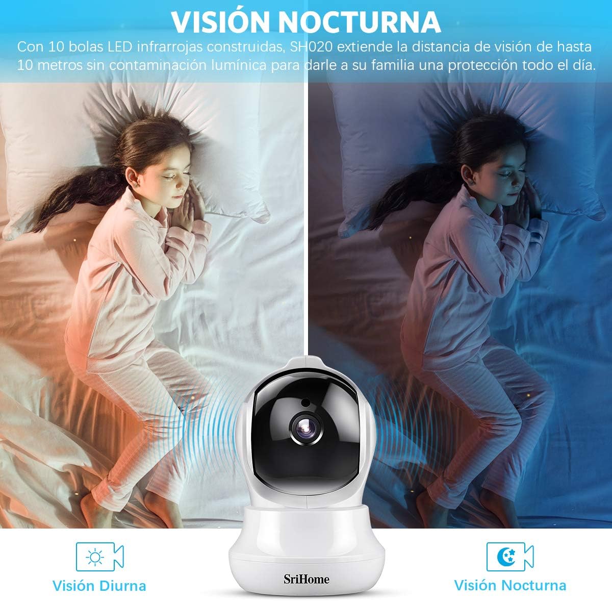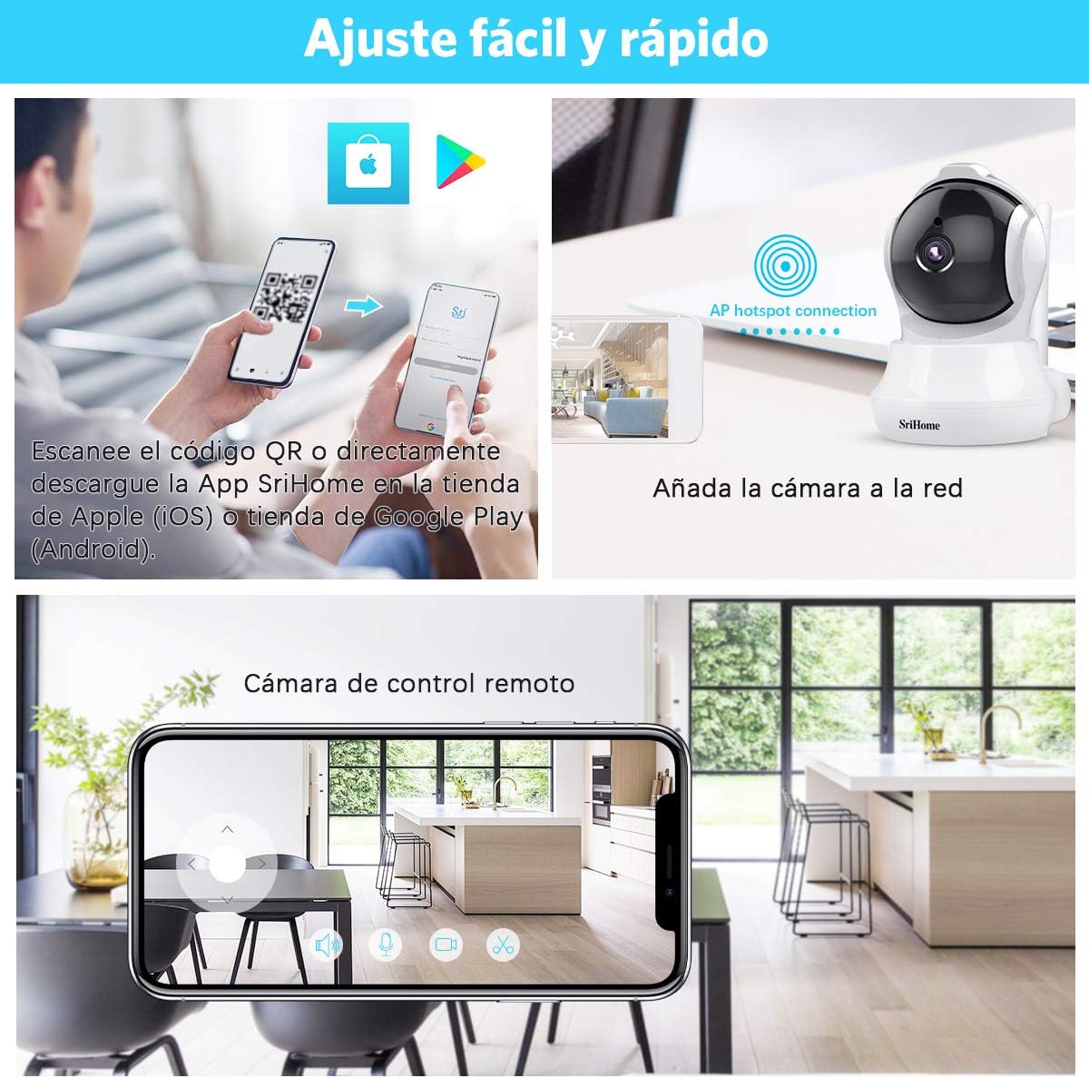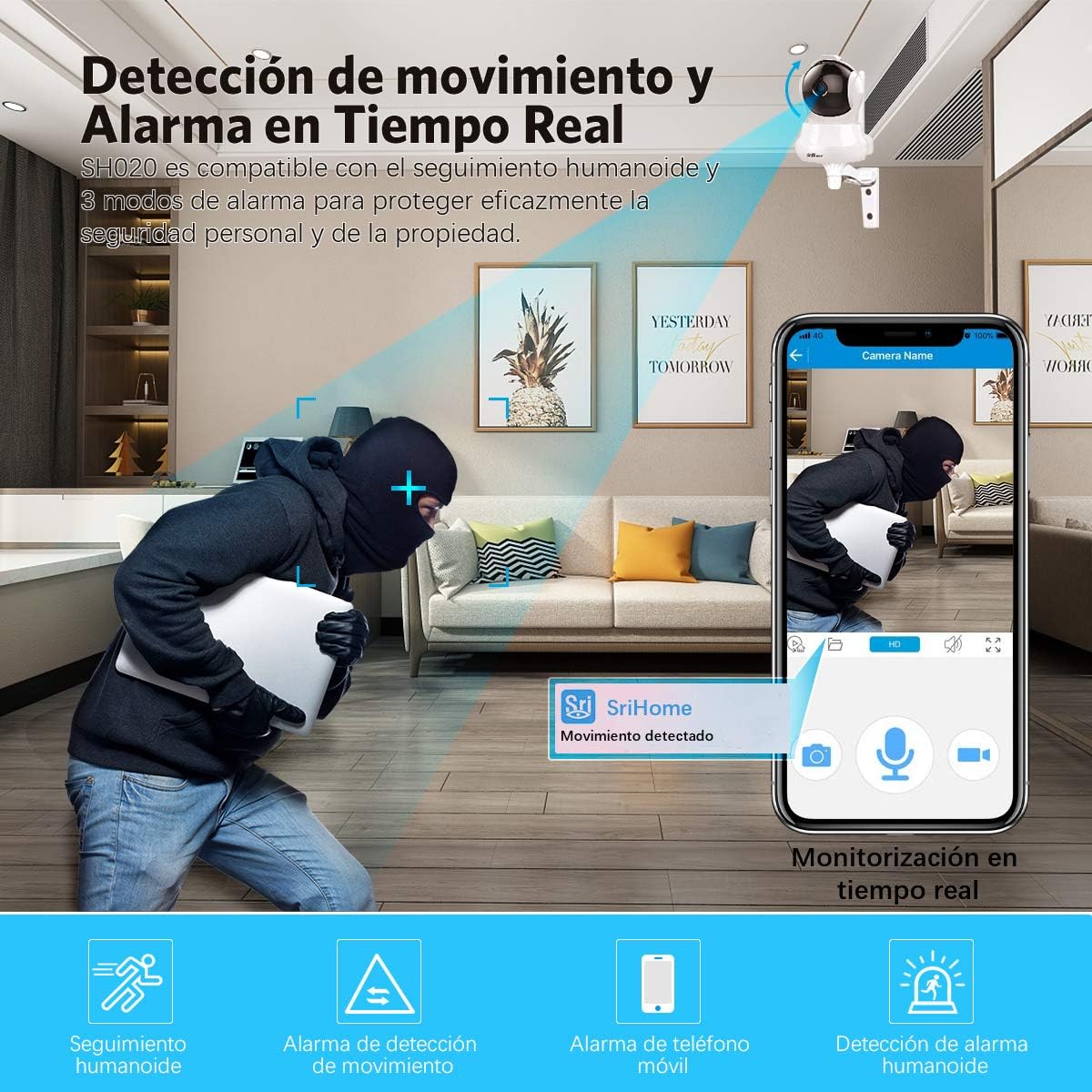 【Detección y alerta】Con una función construida de alerta tecnológica de detección de actividad de alta sensibilidad, encender las notificaciones push para estar al tanto de las cosas, cuando se detectan objetos en movimiento, la lente hará un seguimiento y la alarma se enviará a los dispositivos en menos de 3 segundos. Simplemente abra la aplicación SriHome para comprobar rápidamente lo que está pasando.Se puede añadir tantas cámaras como deseen en su APP para monitorizar varios lugares.