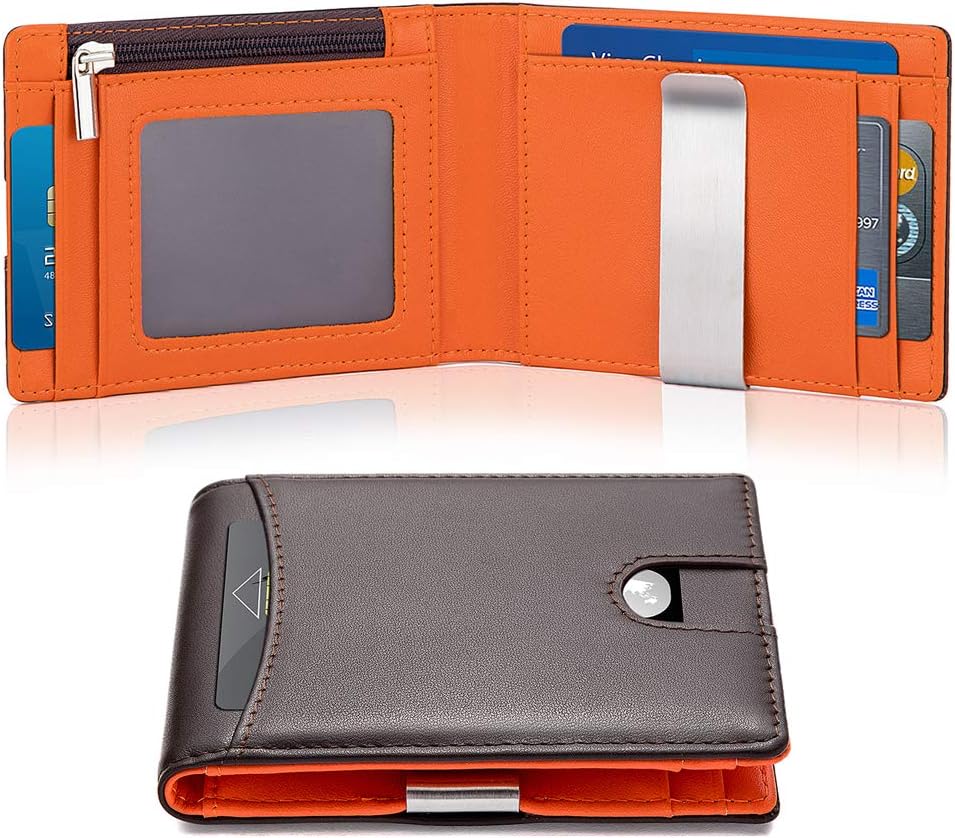 Cartera ofrece seguridad y funcionalidad, terminado en 8 puntos de sutura por pulgada de calidad, 1 ventana de identificación transparente permite un acceso rápido al viajar o en la tienda o lugar de trabajo, 6 ranuras para tarjetas llevan tarjetas de crédito en el interior, 1 ranura para el pulgar afuera, 1 bolsillo para monedas con cremallera El clip de dinero metálico 1 le permite recortar efectivo.