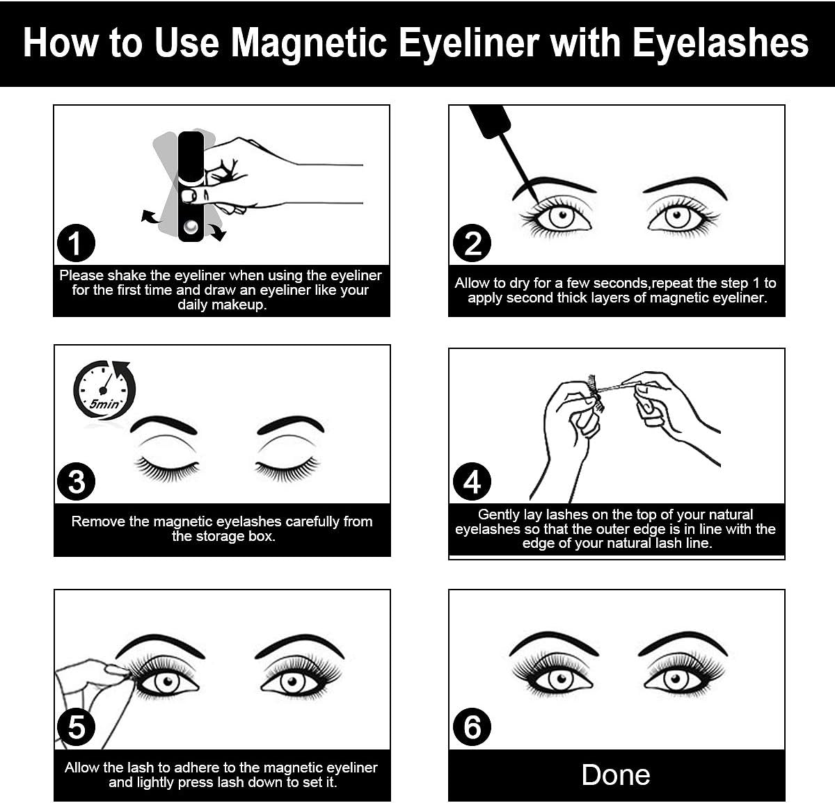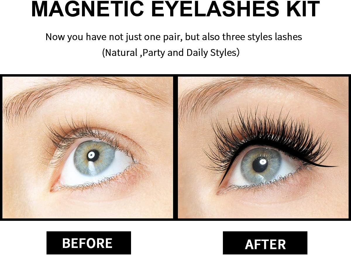 ♥ FÁCIL DE USAR: Agite el delineador ligeramente antes de usarlo, luego aplique el delineador magnético como otros delineadores de ojos, espere unos minutos, déjelos secar por completo y pegue las pestañas magnéticas para tener las pestañas encantadoras. ¡No desorden! ¡Sin estrés!