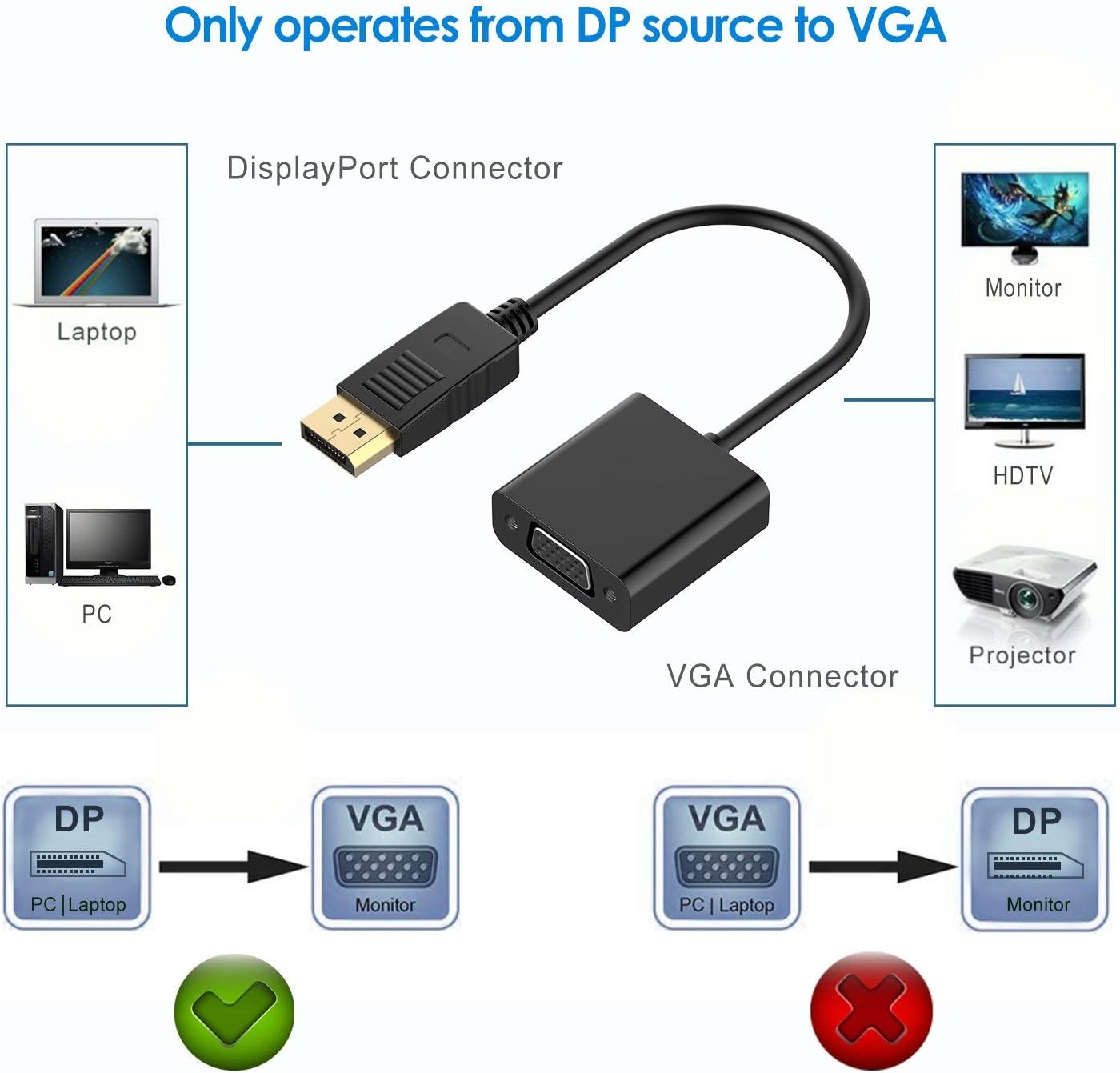 Conecte un DisplayPort (DP, DP ++, DisplayPort ++) portátil o de escritorio a un monitor o proyector con entrada VGA equipada; Se requiere un cable VGA (se vende por separado)
