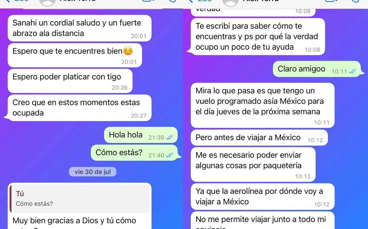 Sinaà recibió un mensaje de su amigo Alex, quien vive en Estados Unidos, contándole que enviarÃa electrodomésticos a México y necesitaba de su ayuda para que recibiera el paquete en su casa. Incluso le envió una foto de la factura del envÃo.